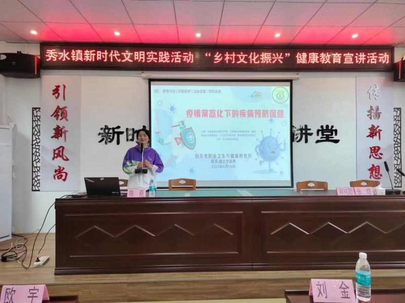为进一步履行驻镇帮镇扶村工作职责,发挥韶关开放大学社区教育职能优势,普及健康知识,做好疫情防控工作。4月15日上午,韶关开放大学邀请韶关市职业卫生与健康教育所副所长陈苑在秀水镇新时代文明实践中心开展新时代文明实践活动--“乡村文化振兴”健康教育专题讲座,韶关开放大学党委委员、副校长邓纯聪,秀水镇主要领导同志和干部群众约40余人参加了讲座。