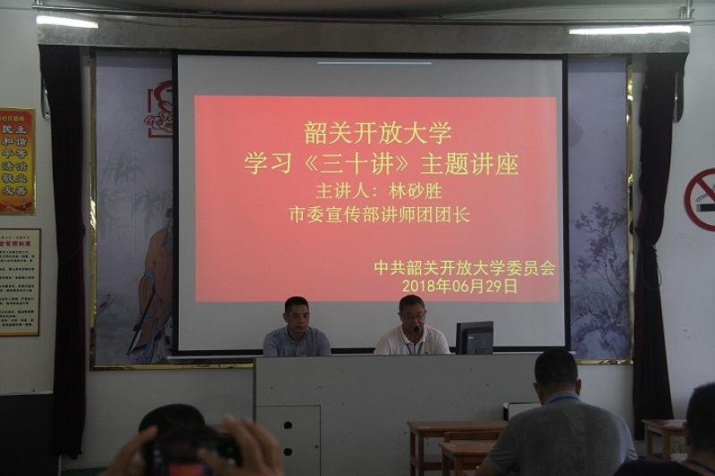 最后,钟永红强调,全校各支部、各科室要以此次讲座为契机,进一步提高政治站位,进一步树立“四个意识”、增强“四个自信”,切实把思想和行动统一到习近平新时代中国特色社会主义思想上来,统一到以习近平同志为核心的党中央的重大决策部署上来。同时还强调,《三十讲》是学习习近平新时代中国特色社会主义思想的重要辅助读物,要认真通读、深入研学,把学习《三十讲》与学原文读原著、与学习党的十九大精神、与推动工作实践结合起来,真正做到学用贯通、知行合一,切实推动韶关开放大学转型发展,为韶关经济社会发展作出新的应有的贡献。