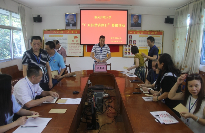 为弘扬中华民族扶贫济困、助人为乐的传统美德,根据市委、市政府《2019年韶关市‘广东扶贫济困日’活动工作方案》要求,围绕 “决战脱贫攻坚,助力乡村振兴”主题,28日上午,学校在一号楼三楼会议室举行扶贫捐款活动。