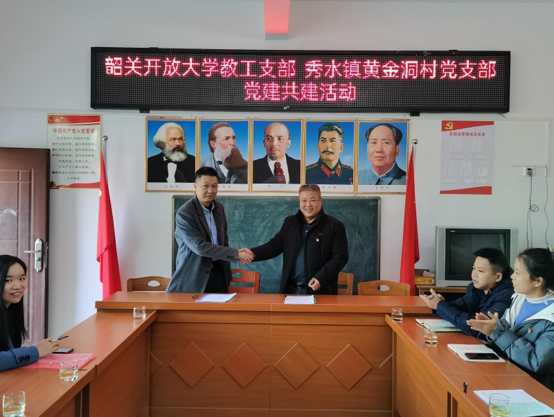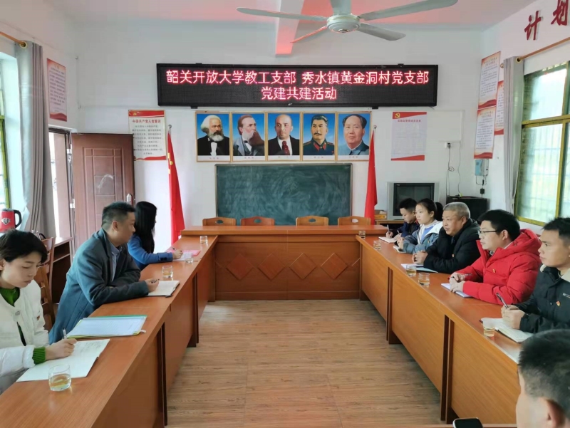 为深入学习贯彻习近平总书记关于“三农”工作和加强基层党组织建设的重要论述精神,落实省委、市委加强基层党组织建设和实施乡村振兴战略工作部署要求,推动抓党建促乡村振兴各项任务落实落地,着力推动农村基层党建与乡村振兴深度融合,12月8日,韶关开放大学党委委员邓纯聪副校长、教工支部书记吴珊、社区教育指导科刘金前往乐昌市秀水镇黄金洞村开展党建共建活动。乐昌市秀水镇纪委书记陈宗生、镇组织委员邝丽红,黄金洞村党支部书记张志平以及部分党员共11人参加了党建共建座谈会。