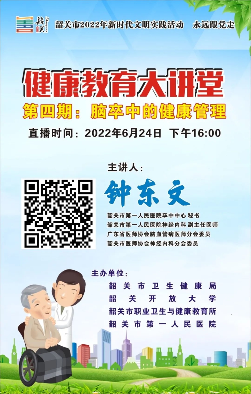 本期《健康教育大讲堂》特邀广东省医师协会脑血管病医师分会委员、韶关市医师协会神经内科分会委员、韶关市第一人民医院神经内科钟东文副主任医师,以“脑卒中的健康管理”为题,为您介绍脑卒中的预防、识别和救治知识,避开误区、雷区,享受健康生活!