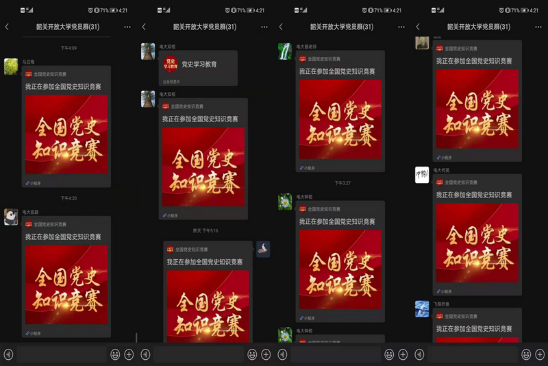 我校教工支部广泛动员、层层发动,以开展全国党史知识竞赛活动为契机,充分发挥党员的模范带头作用,在广大党员干部、教师中开展了一次以知识竞赛为形式的党史学习教育。我校党员干部、教师参赛热情高涨,全体在职党员、入党积极分子共31人次参加了此次活动,并通过党员微信群分享竞赛成绩、学习心得,营造了学史爱党、知史爱国、明史奋进的良好氛围。