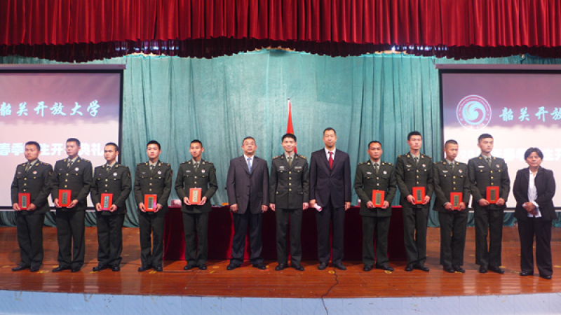 最后,来自中国人民解放军某部队的十几位学员合影留念,经过在韶关开放大学两年半的学习,这些学员很好地处理好服役和专业文化学习的关系,积极提升自己,顺利完成了专科的学业。