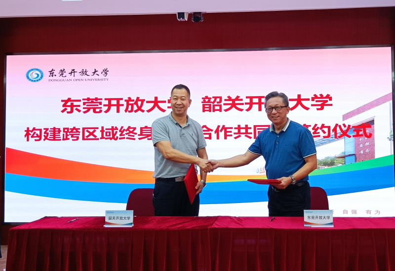 5月7日下午,韶关开放大学与东莞开放大学举行了合作共建跨区域终身教育合作共同体签约仪式,韶关开放大学钟永红校长、张朝平副校长、东莞开放大学阳涌校长、张念伟副校长出席了签约仪式。双方表示将进一步深化合作发挥各自资源优势,依托共同体实现优质终身学习资源跨区域共建共享,进一步打造基于“一库两系统”一站式终身学习支持服务平台,并以“云上合班”方式持续开展市际大课堂教学,为全省学习型社会建设提供创新路径。