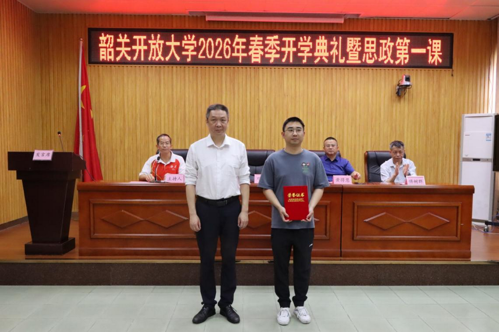 随后,国家开放大学优秀毕业生代表饶智聪、2026 级春季新生代表谢婷先后发言。饶智聪深情感谢母校的悉心培育与老师的谆谆教诲,分享了自己在职求学、兼顾工作与学业的坚守与成长,并表示将把法学知识运用到辅警基层岗位中,依法履职、守护公平正义,以实干担当回报母校培养。26 春法学本科新生谢婷在发言中表示,自己已获工学学士学位并通过法律职业资格考试 A 证,选择在韶关开放大学继续攻读法学本科,旨在构建系统专业的法学理论体系、提升法律综合素养,努力成长为懂技术、通法律的复合型人才。她号召全体新生珍惜学习机会,合理平衡工作与学业,同学互助、携手共进,坚持终身学习,以实干笃行成就更好的自己。